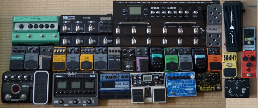 There’s almost 30 pedals there. From big amp/effects modelers to standard-form-factor ones, from OGs to cheap clones, from 80s vintage devices over current makes of old designs, and from things I had for over 30 years to fairly new (like: yesterday) acquisitions.